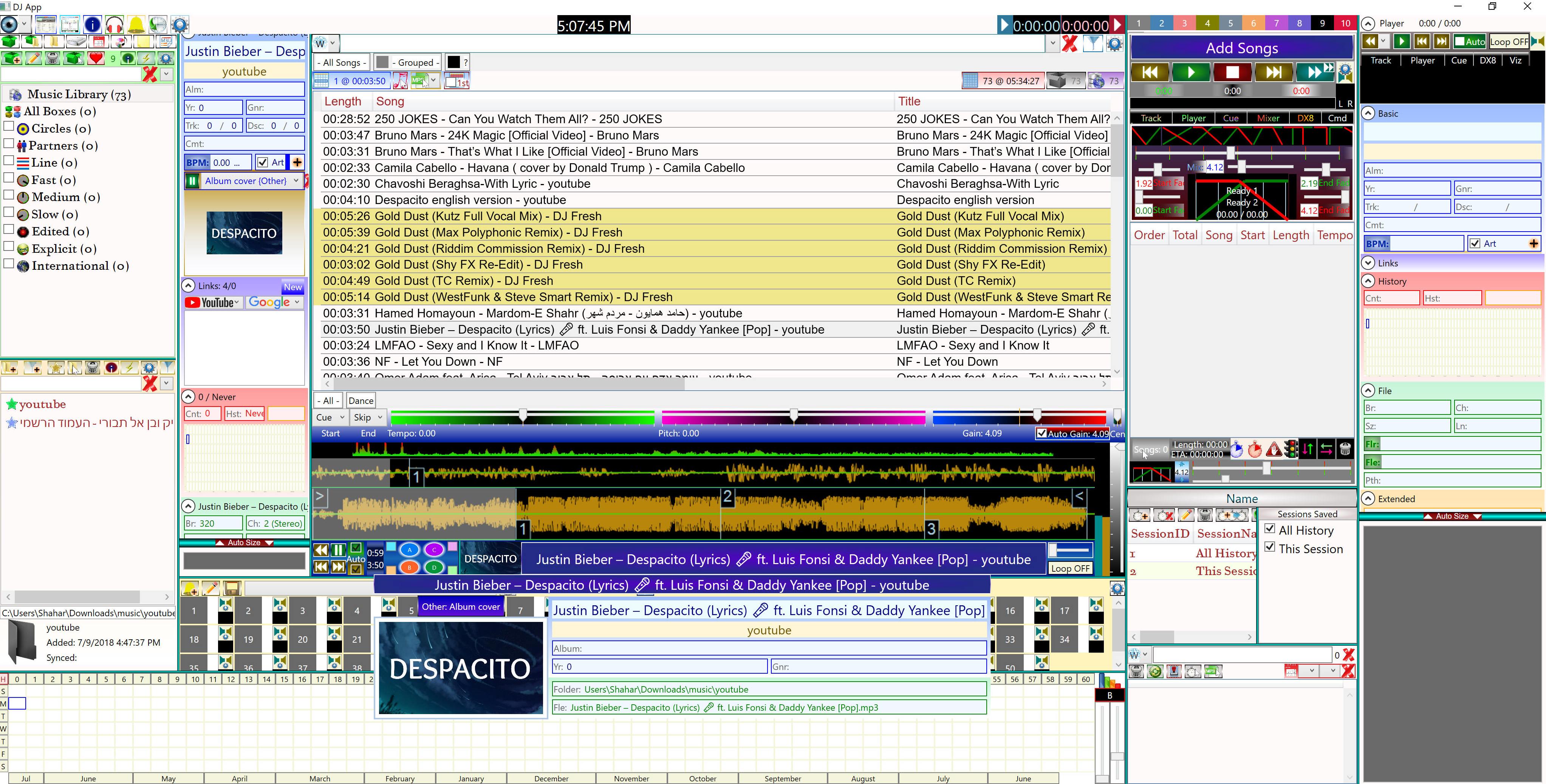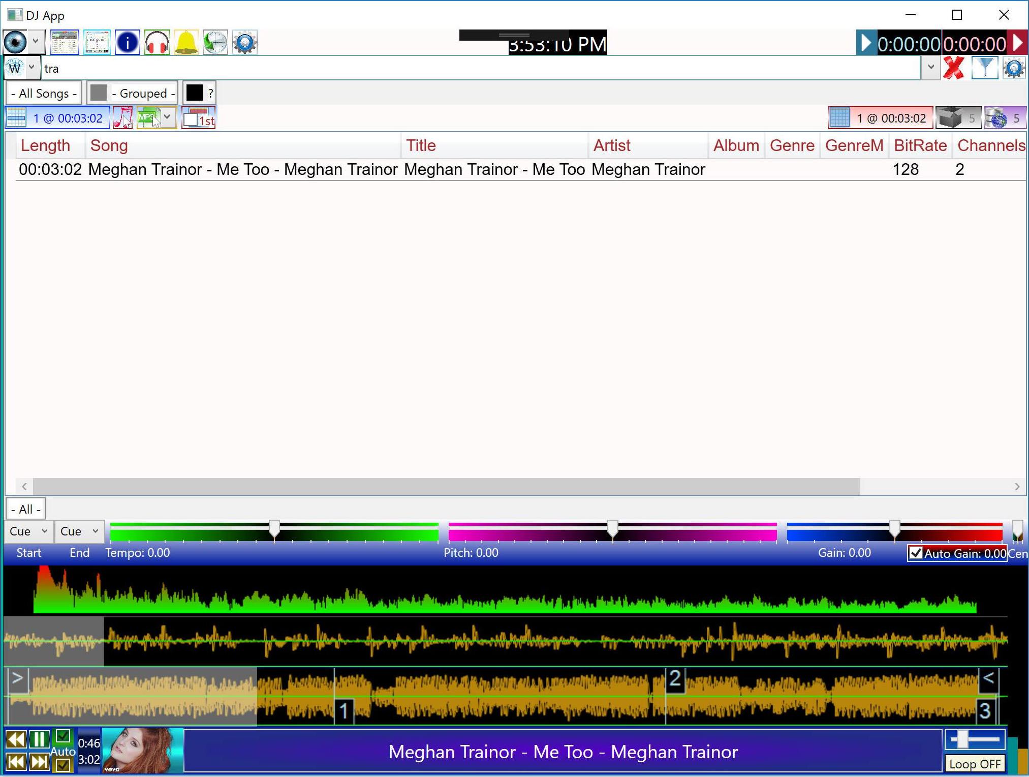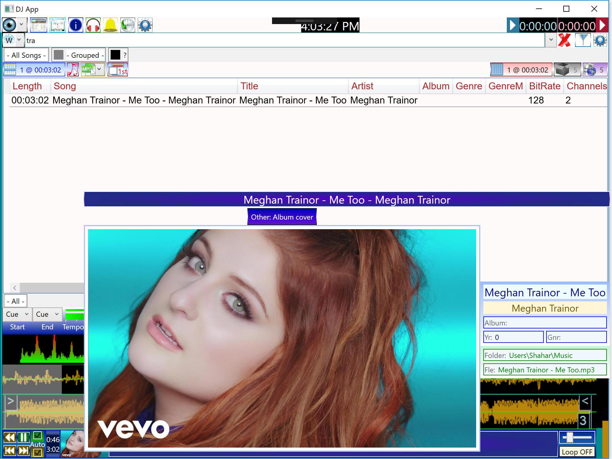 | Info | All the info for a song in one compact vertical panel. -Large visual of track wave form. -Tempo, Pitch, Auto Gain, Loop, EQ, DX8, and Hot Cues. -Auto Cue: Skip Silence or by Percent -Change sound output device on the fly . -All the id3 tags you know as well as some id3 tags you don't. -All the file info you need. - History Summary - Multiple Links - Multiple Art from Tags with a mouse over to show Art in original size. -Lyrics from id3 tag. -VU meters. - Album Art that changes every few seconds and mouse hover to see art in real size.