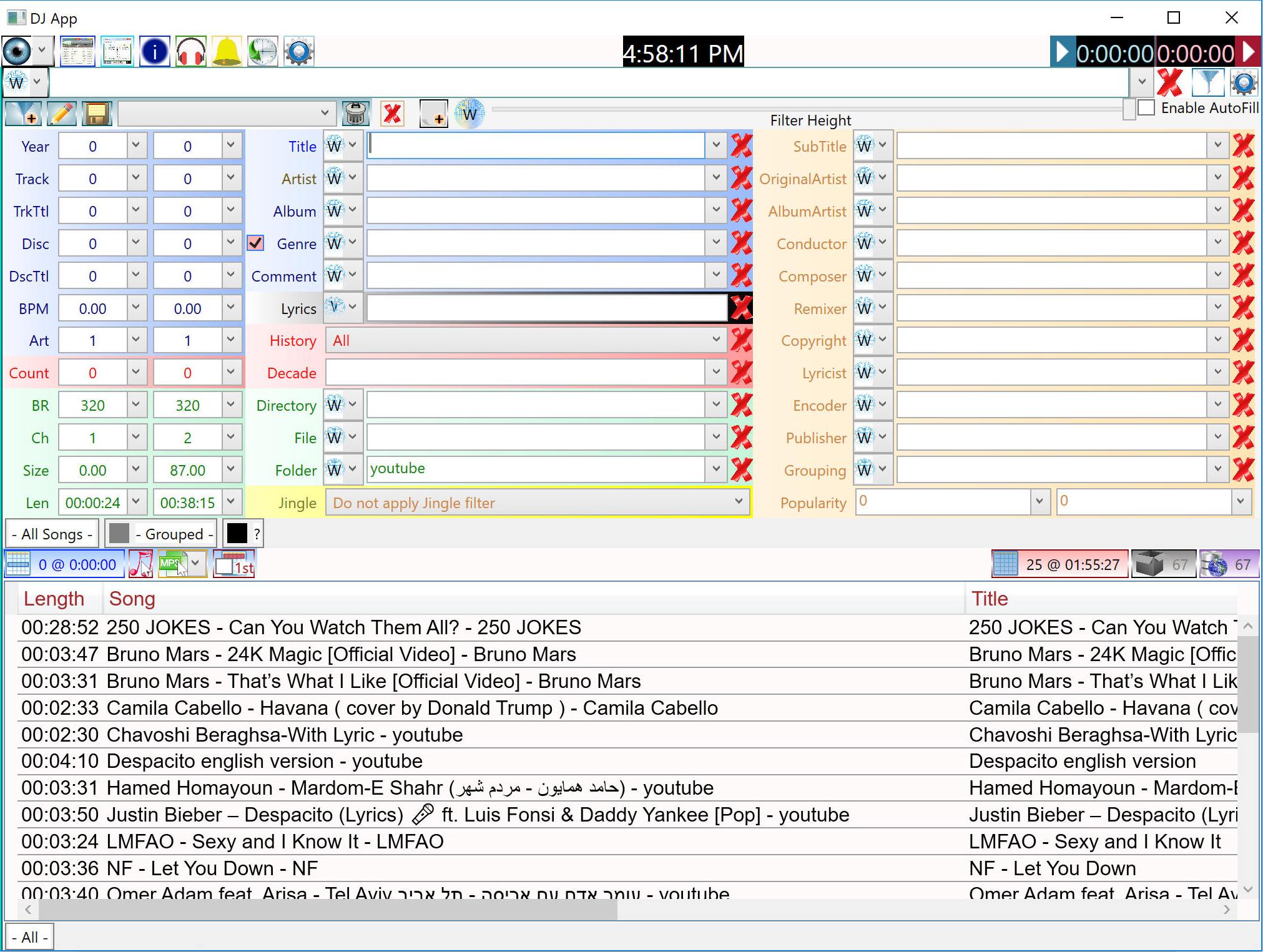 | Library | Intuitive filtering with drop downs or manual search. Search as Wild (Multi Contains), Contains, Exact, Start, End, Not Contains, Blank, or Filled in any specific field or Global. Easily add music, Videos, and Pictures by dropping in folders or files. Filters show distinct count of all items: Artist, Title, Album, Genre, Folders, Files, Years, etc. More fields to see and search: Lyrics, Lyricist, Sub Title, Remixer, Composer, Publisher, Conductor, and more. Show/Hide Music Library, Videos Lirary, and Pictures Library. Drag out to other programs with auto add Session History. Export to Excel
